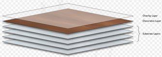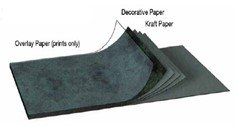 "Laminate," aka, high pressure decorative laminate. All HPDL products are manufactured in a similar way, from layers of paper saturated with melamine and bound together with phenolic resins. Only the second layer is the decorative layer. The top layer is a clear protective coat. This technique has remained largely constant for over half a century, simply because it works so well and even modern technology has not come up with anything better for a hard-wearing, low cost benchtop or splashback.